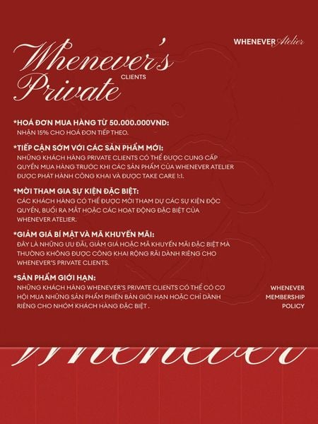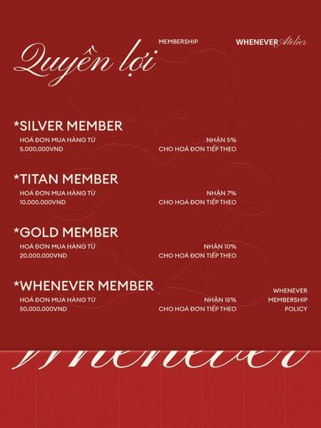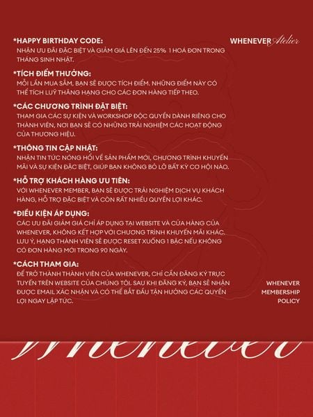 WHENEVER rất cảm ơn các quý khách hàng đã tin tưởng và ủng hộ trong suốt thời gian qua. Với chương trình membership của WHENEVER, bạn không chỉ đơn thuần là khách hàng, mà còn là một phần của cộng đồng độc quyền, nơi những lợi ích tuyệt vời về quyền lợi, dịch vụ và các chương trình đặc biệt chỉ dành riêng cho WHENEVER MEMBERSHIP.
