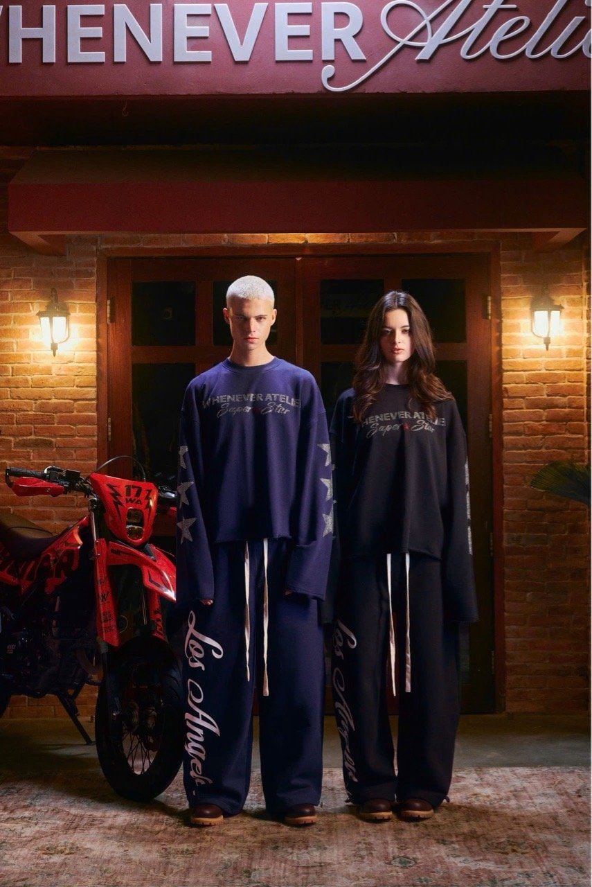 Form boxy oversized, đính cườm ngôi sao hai tay và thân trước, in hình thân sau.